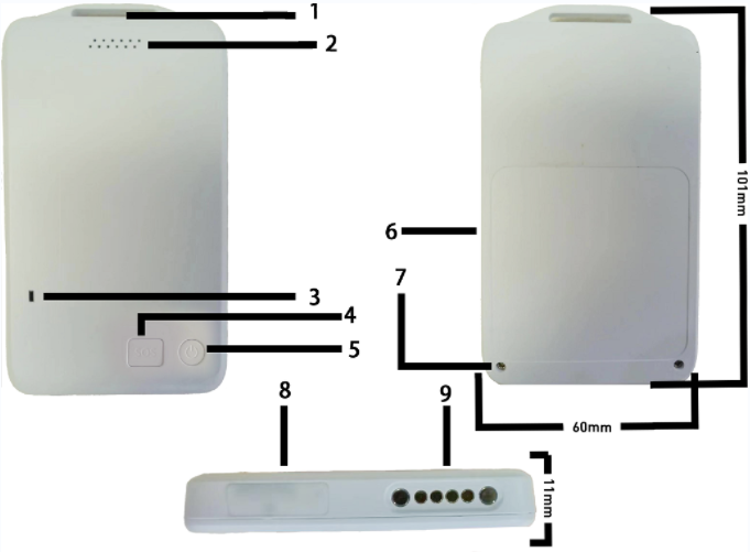 1. 掛繩口 2. 語音播報孔 3. 工作指示燈 4. 報警按鍵 5. 開關機按鍵 6. 銘牌