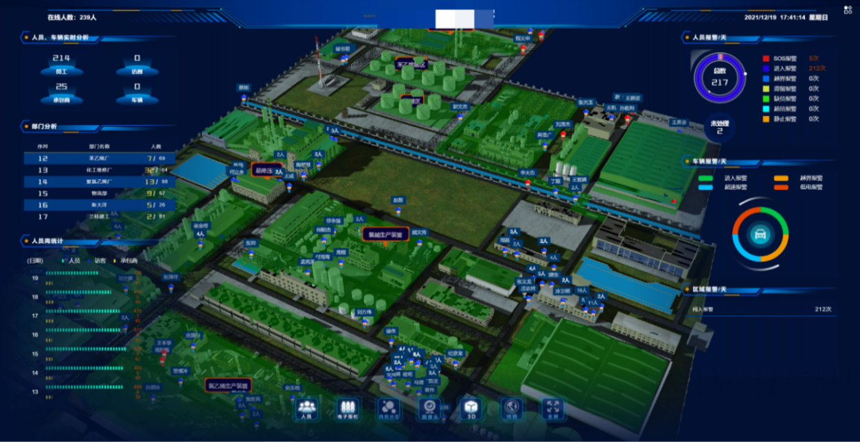 通過管理平臺,農藥廠管理人員能夠在廠區電子地圖(支持3D可視化,更直觀呈現廠區布局)上,實時、精準地追蹤每一位作業人員的位置。無論是在忙碌的生產車間,還是在廣闊的室外存儲區,人員的位置動態一目了然。這有助于管理人員及時了解人員分布情況,合理調配人力資源,提高生產效率。