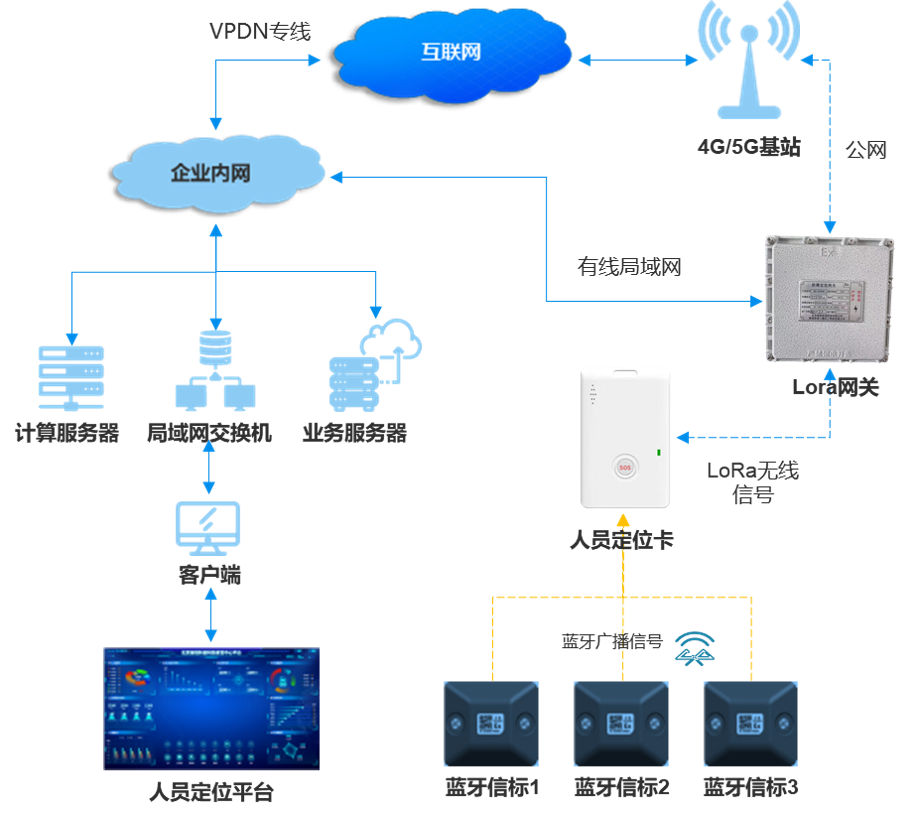 LoRa基站負責收集定位標簽發送的位置數據,并將這些數據通過4G/5G網絡或網線傳輸給定位引擎。定位引擎通過復雜的定位算法,將接收到的位置數據解算為具體的地理位置,并與電子地圖引擎進行信息處理后,在展示終端(如電腦或手機)上實時展現人員位置。