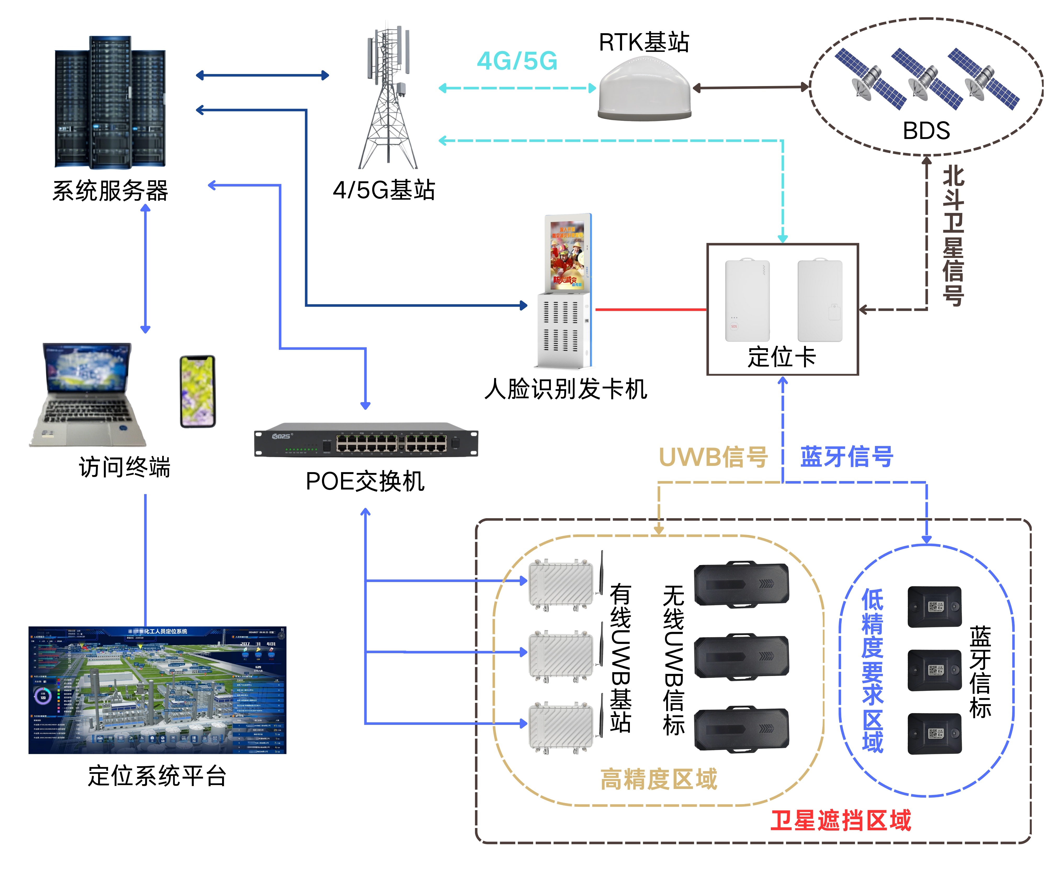 采石場的作業特性決定了其對定位系統的嚴苛要求。一方面,露天采場開闊區域需要高精度定位保障車輛精準調度與路徑規劃,而邊坡下方、廠房周邊、物料堆放區等區域則存在衛星信號遮擋問題,易形成定位盲區;另一方面,采石場作業環境惡劣,粉塵多、振動強、溫差大,對定位設備的穩定性、耐久性和防爆性能提出了極高要求。同時,采石場人車流動頻繁,需實現多目標同時定位且信息實時同步,避免因數據延遲導致調度失序或安全預警滯后。單一的衛星定位、藍牙定位等技術均存在明顯短板,無法兼顧全域覆蓋、高精度與高可靠性的多重需求,融合定位技術成為必然選擇。