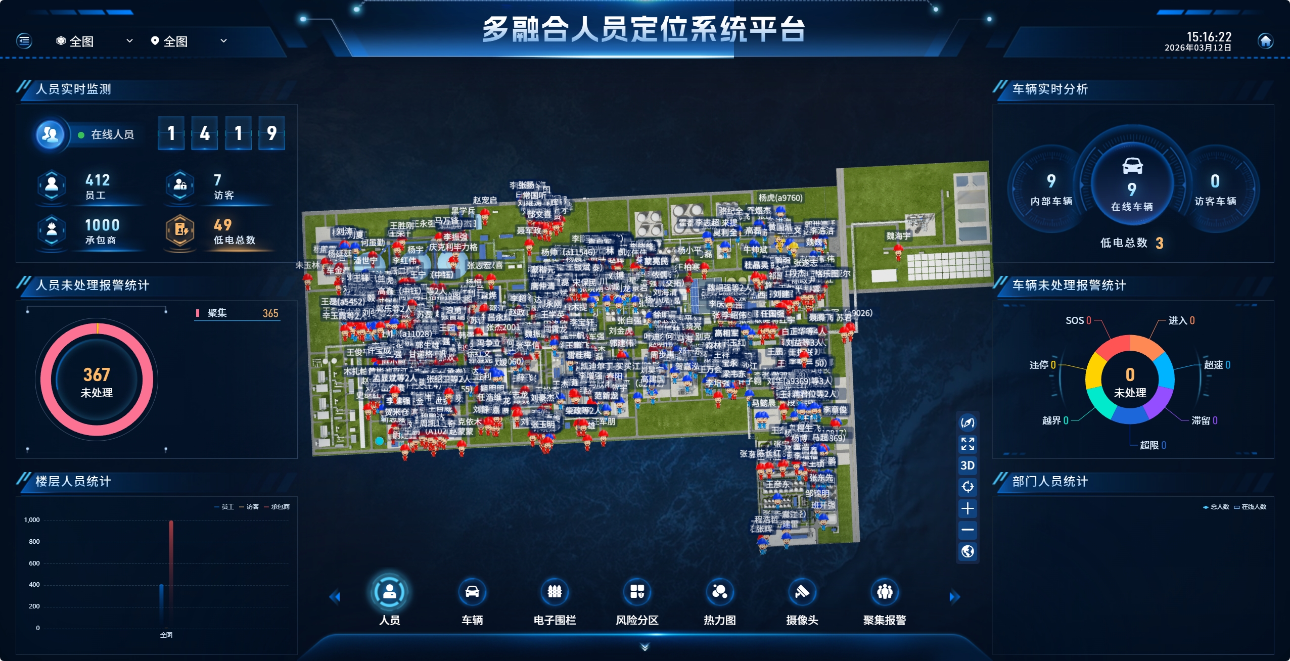 新銳科創人車定位系統集成實時定位、電子圍欄、軌跡回放、智能預警、車輛調度、數據分析等全功能模塊。管理平臺基于GIS技術構建園區2D/3D數字孿生模型,可直觀可視化呈現人員、車輛實時位置與分布狀態,操作簡潔、界面友好。系統支持多級權限管理、多端數據同步,管理人員可通過PC端、移動端隨時隨地查看數據、處置預警。同時,系統可與園區視頻監控、門禁、消防、報警等系統無縫對接,實現數據互通、聯動處置,構建一體化智慧管理平臺,形成“定位+監控+預警+處置”的全閉環管理體系。